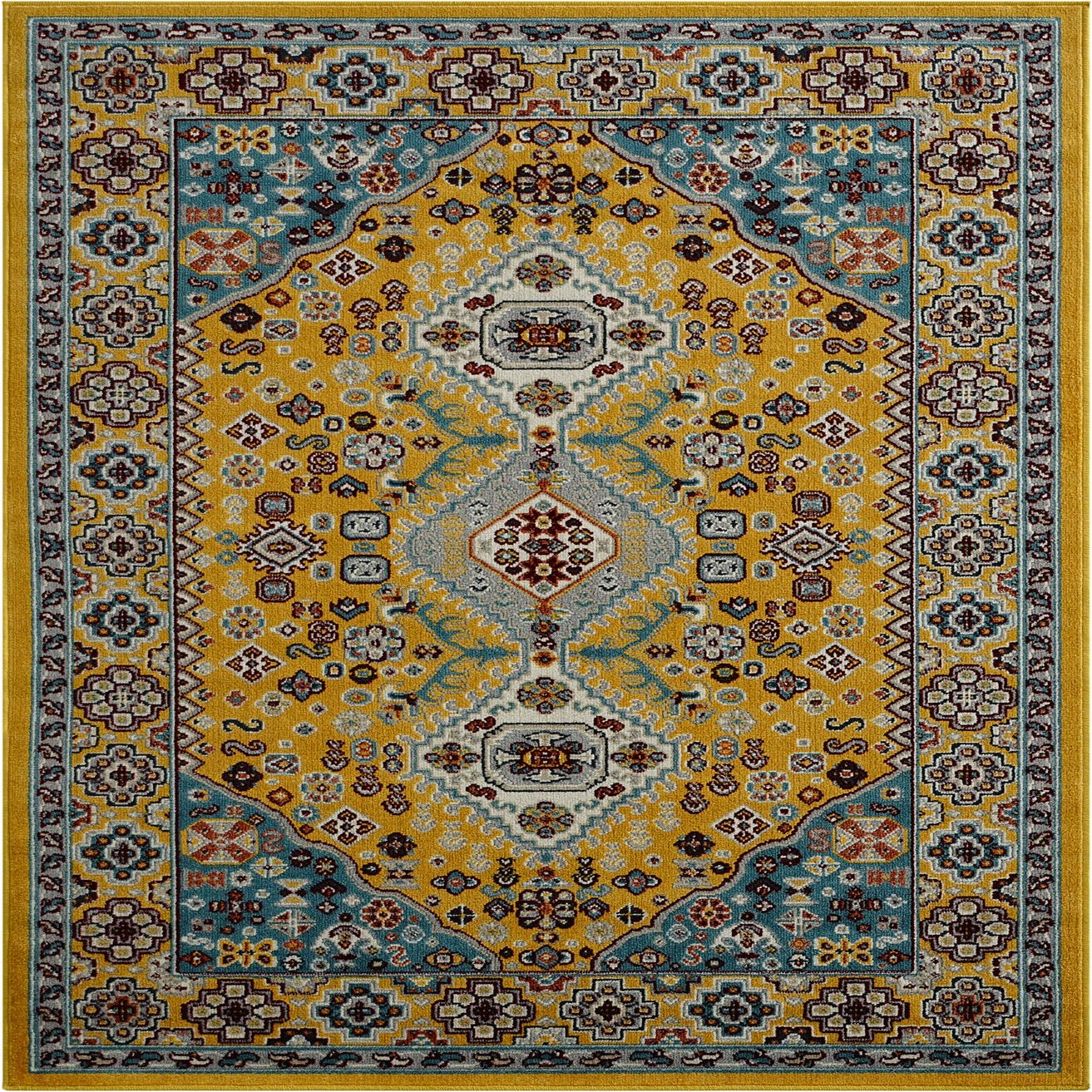 Primary color is Yellow Gold. Colors in this rug include: Yellow Gold, Ivory, Red, Gray, Light Blue.