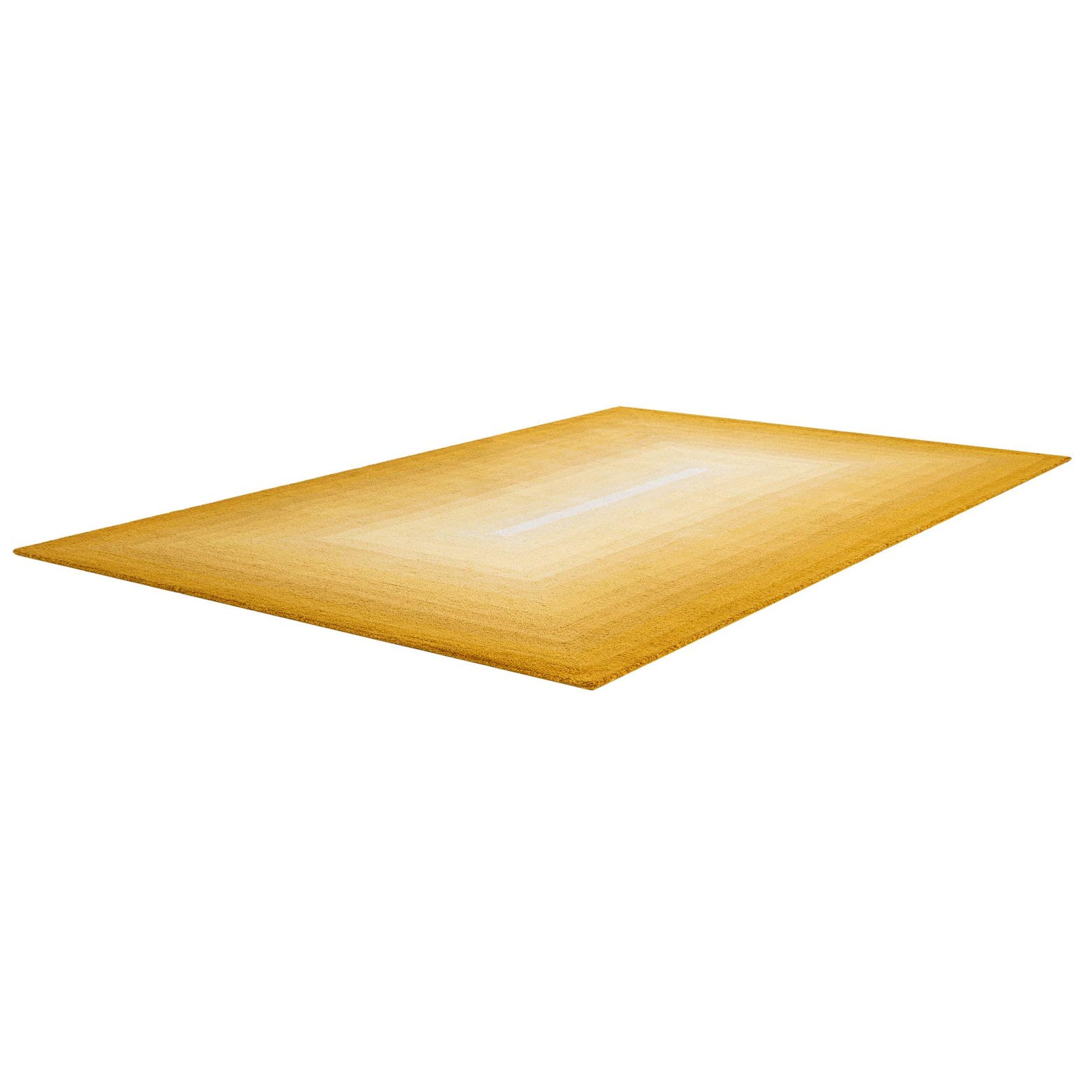 A rectangular 5x8 yellow and gold ombre wool rug with a high pile, featuring a gradient from dark gold edges to a light yellow center.
