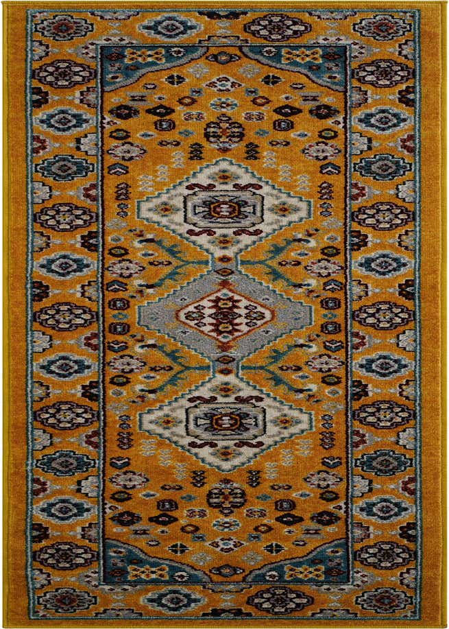 Primary color is Yellow Gold. Colors in this rug include: Yellow Gold, Ivory, Red, Gray, Light Blue.