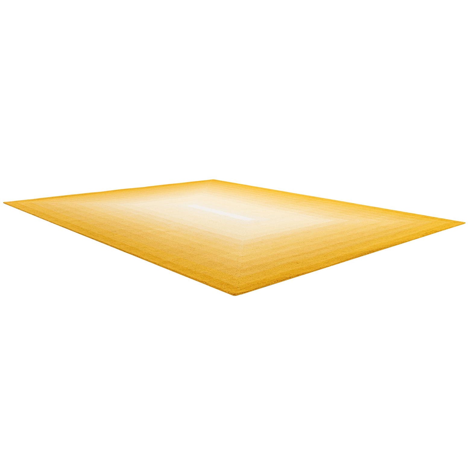A modern 8x10 rectangular wool rug featuring an ombre pattern transitioning from deep gold to light yellow and white in concentric rectangles.