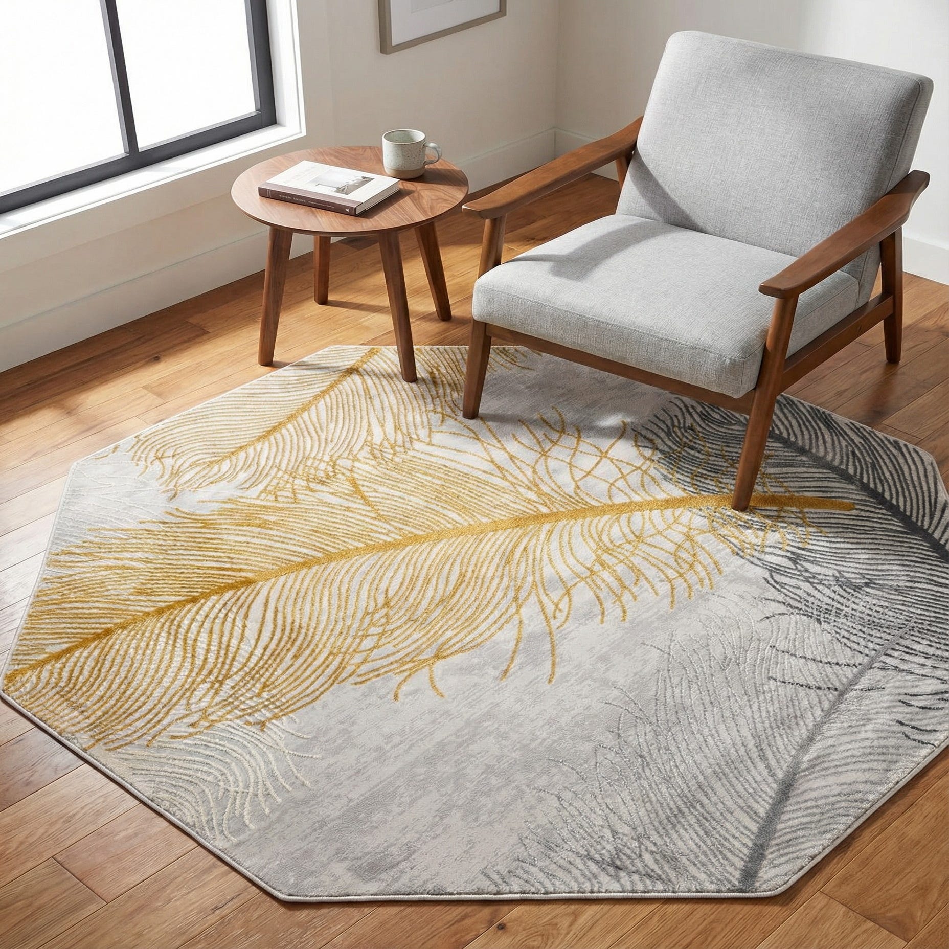 A sweeping feather motif stretches across an octagonal field, the sinuous barbs and fine linear veins creating a sense of movement and airy layering. The background is a soft yellow-gray that warms a room without overpowering it, while feather forms in golden-yellow and ivory trace delicate, overlapping lines that read both organic and modern. The overall look leans contemporary with a nature-inspired accent—clean, artistic, and thoughtfully detailed.
