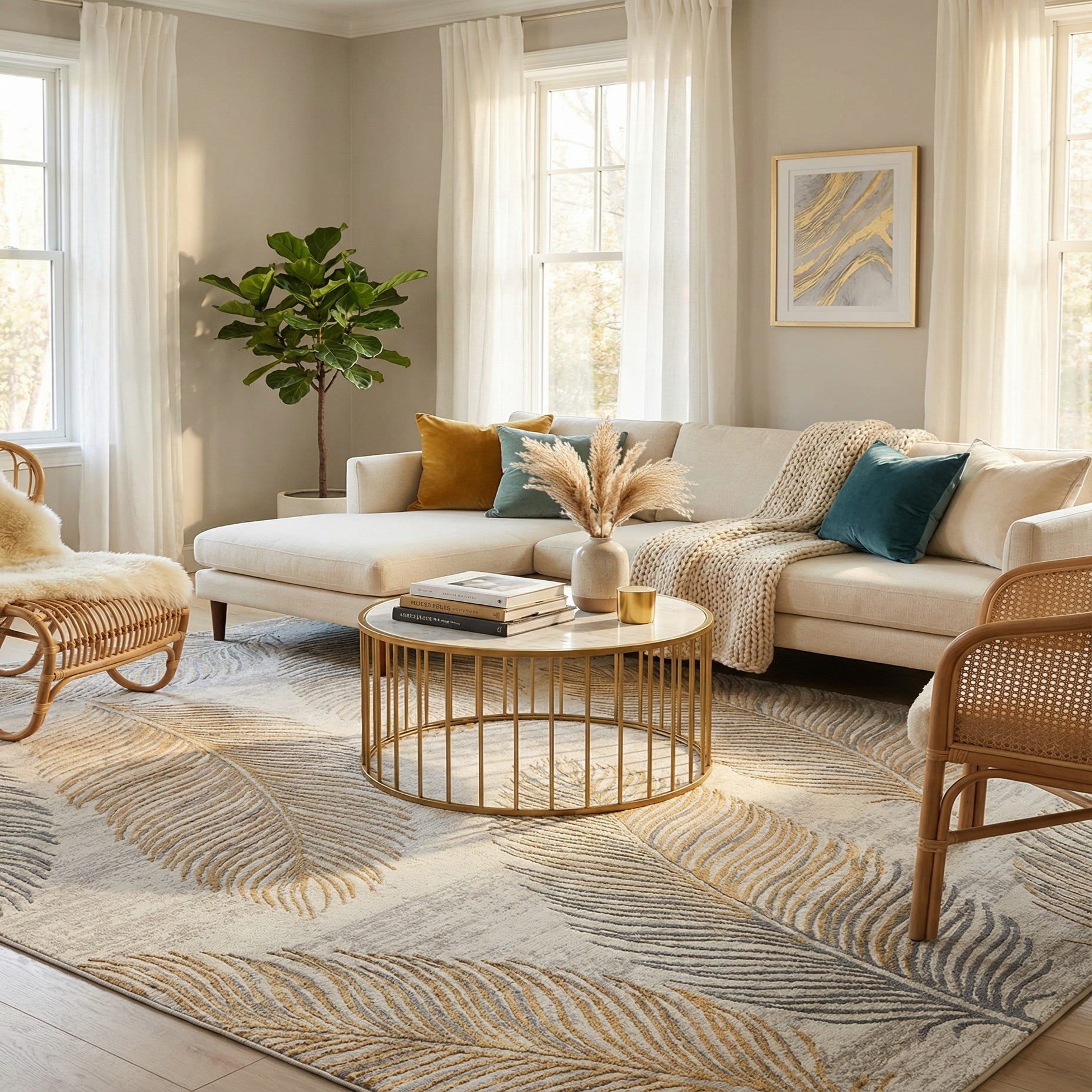 A 7x10 rectangular rug with a modern tropical feather pattern in shades of gray, gold, and white on a light background.