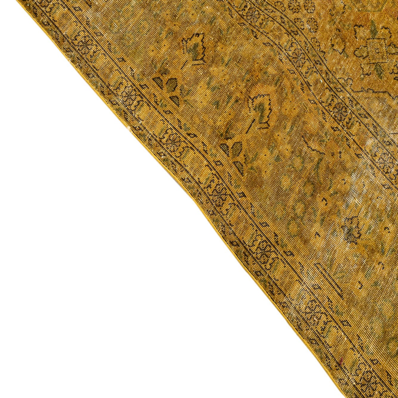 This Ultra Vintage hand-knotted rug exudes a unique charm with its Yellow Green background, complemented by Black and Brown accents. The understated, yet distinct pattern showcases a blend of traditional motifs that create a sense of rich history and timeless appeal. The intricate design, skillfully executed in 100% wool, offers a tactful balance of sophistication and warmth.