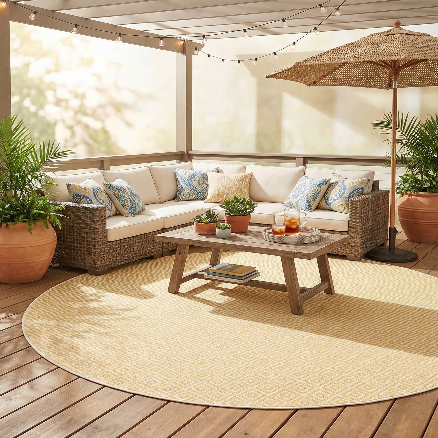 A 13-foot round yellow and ivory Bohemian trellis rug, suitable for indoor or outdoor use on a patio.