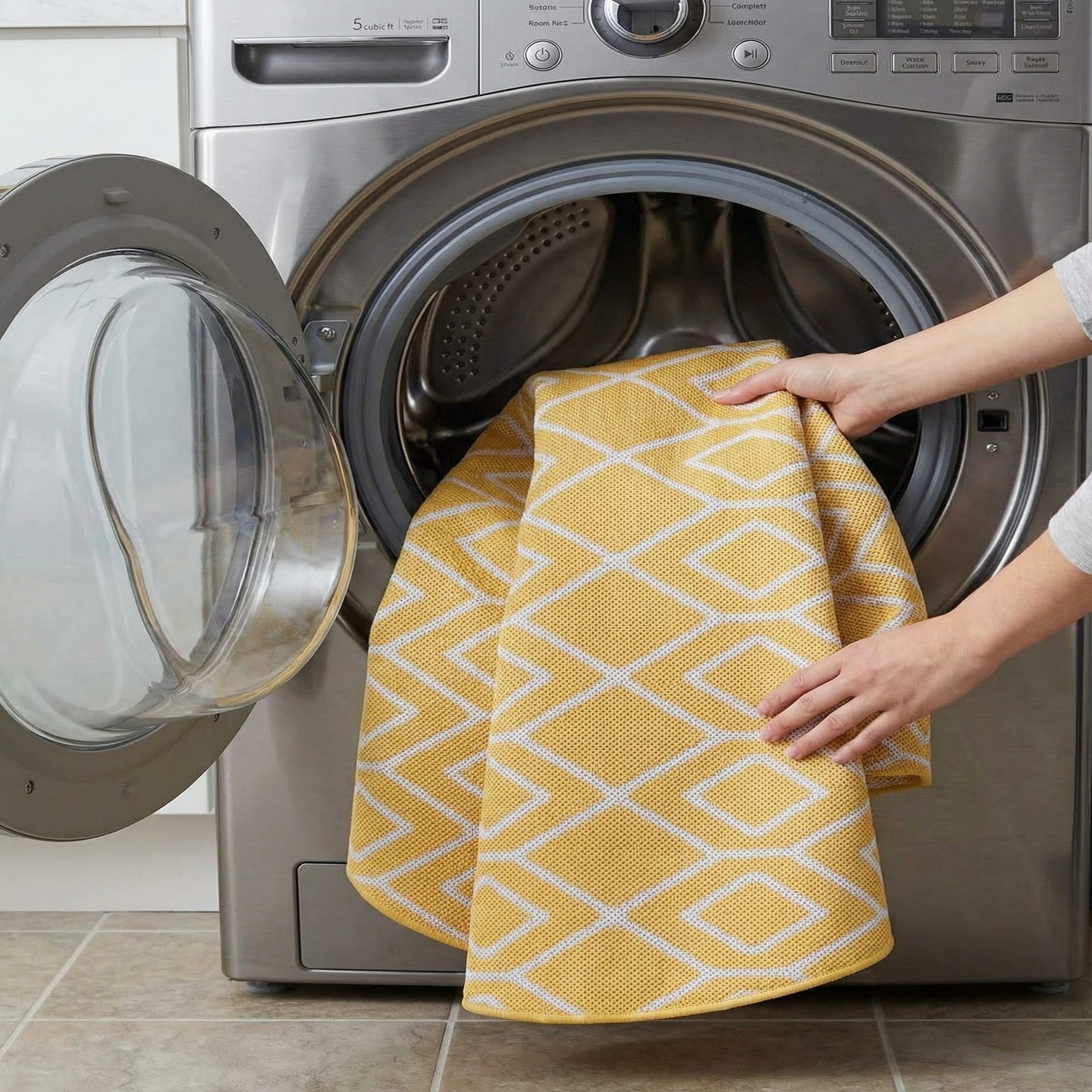 This rug works well on a covered patio, a sunlit balcony, or beneath a small bistro set to add a cheerful, contemporary layer to outdoor seating. It also pairs nicely with white or natural wicker, light teak or painted wood pieces, and navy or gray accent pillows for a fresh, balanced look in casual coastal, cottage, or modern transitional settings.