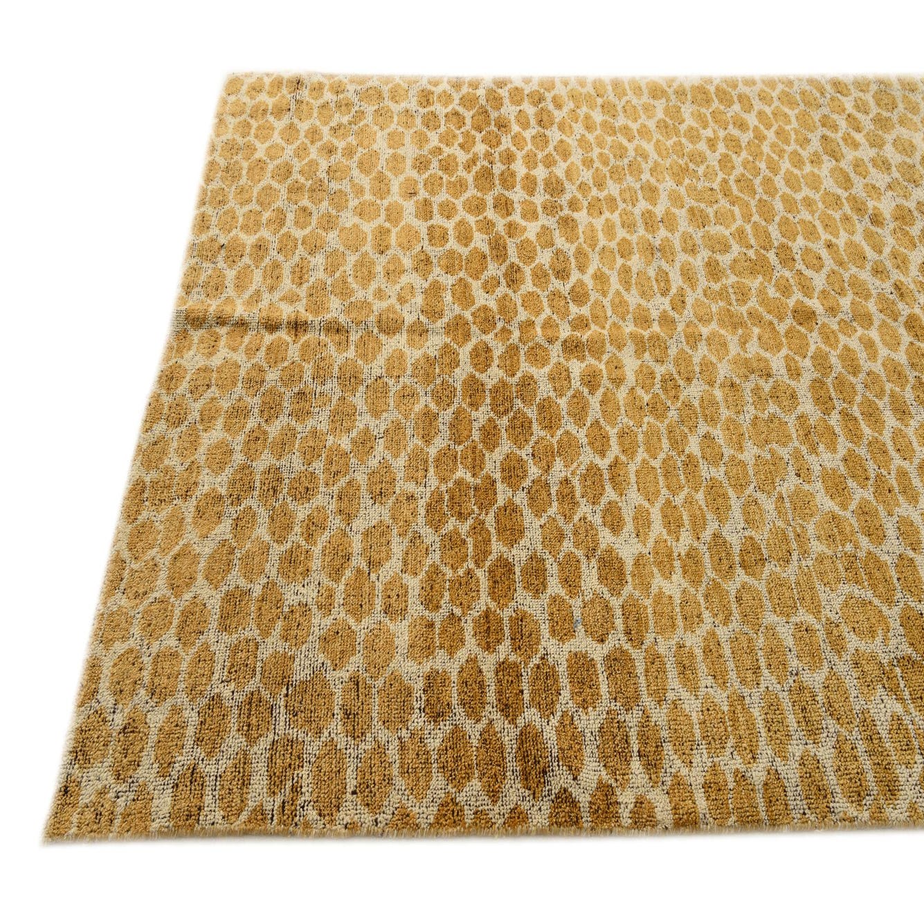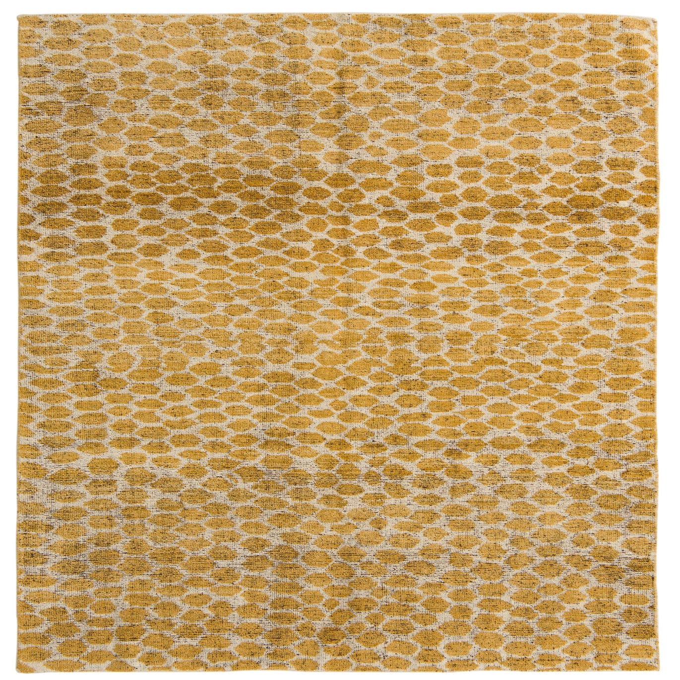 The Darya collection presents a refined 6x9 hand-knotted rug crafted from 100% wool, offering both durability and comfort underfoot. This particular rug showcases an abstract, cellular pattern that provides a modern twist on geometric design, executed in a palette of yellow ivory and black. The background color of yellow ivory sets a warm and inviting tone, with the contrasting black adding visual depth and interest.