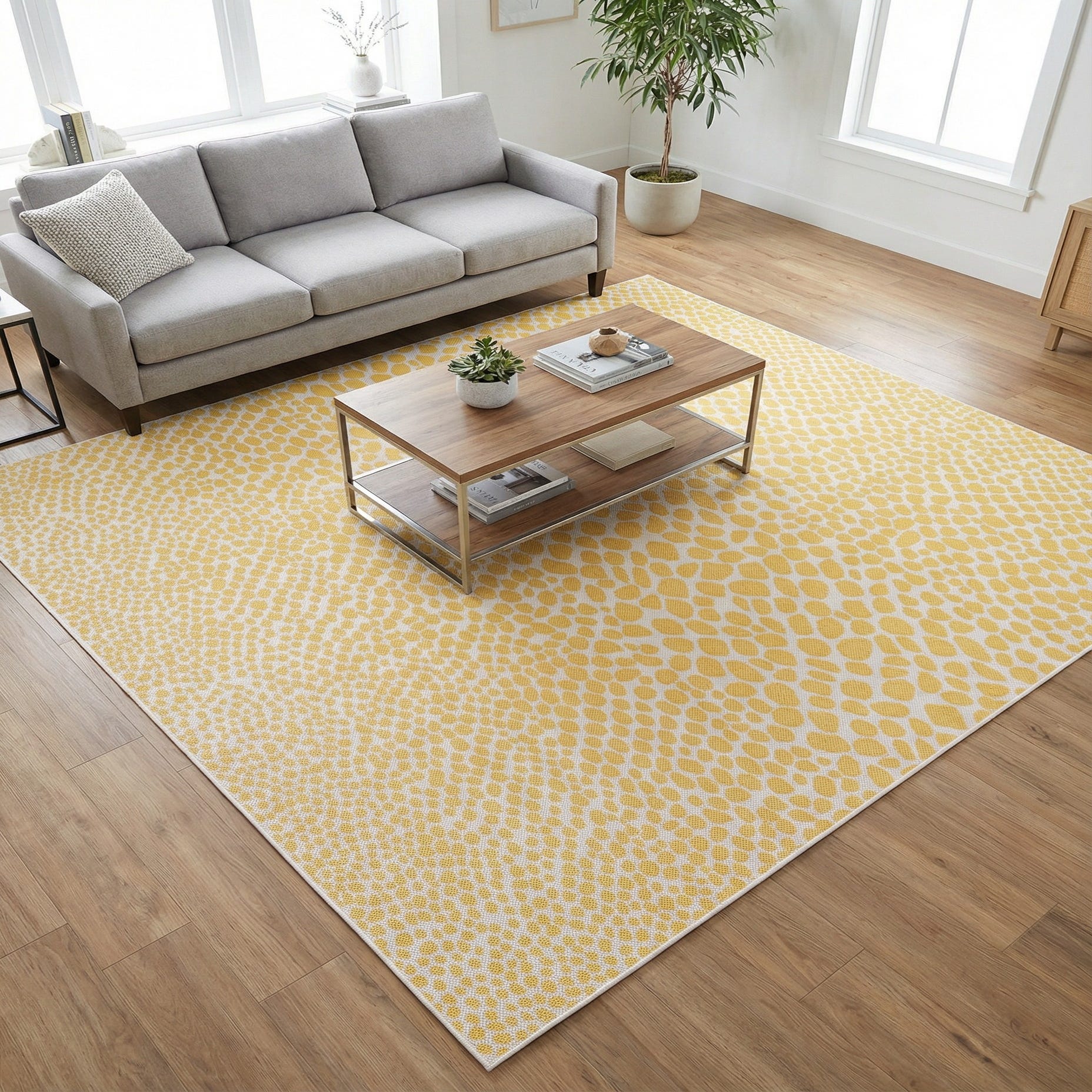Well-suited for patios, sunrooms, or balconies, this rug brings a bright, inviting layer to outdoor seating areas and casual dining spots. It pairs nicely with natural woven furniture, white or navy cushions, and light wood tones, and can also be used to add a pop of color to a neutral indoor living space or foyer. The pattern works equally well in coastal, modern, or transitional schemes where a touch of warmth and subtle visual interest is desired.
