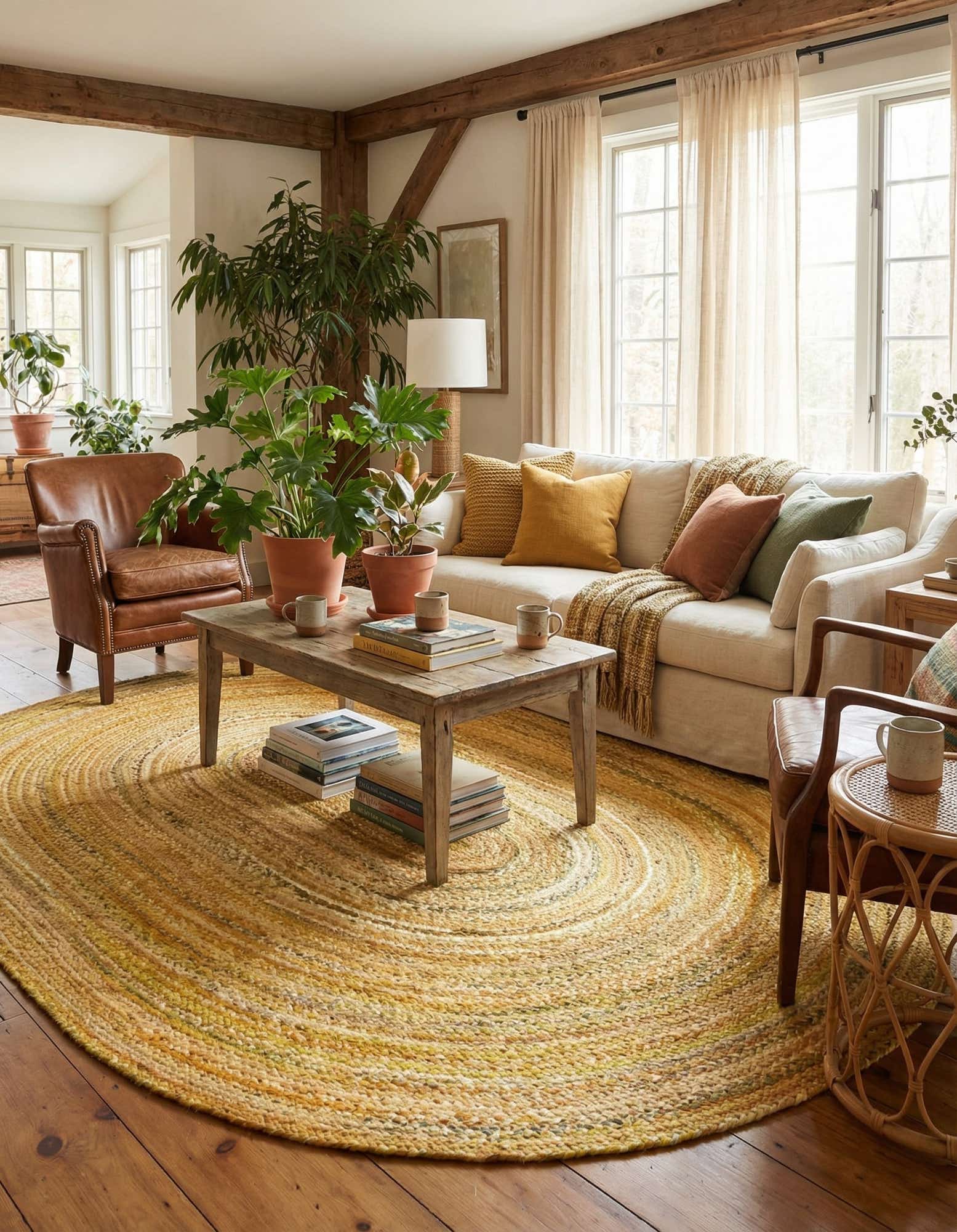 Its casual, lived-in character works well with farmhouse, coastal, bohemian, or transitional interiors. Place it beneath a round dining table, in an entry or kitchen to brighten the space, or layer it over a larger neutral floor covering to add color and texture. Pair with natural wood finishes, white or muted green cabinetry, and woven or leather seating for a relaxed, cohesive look.