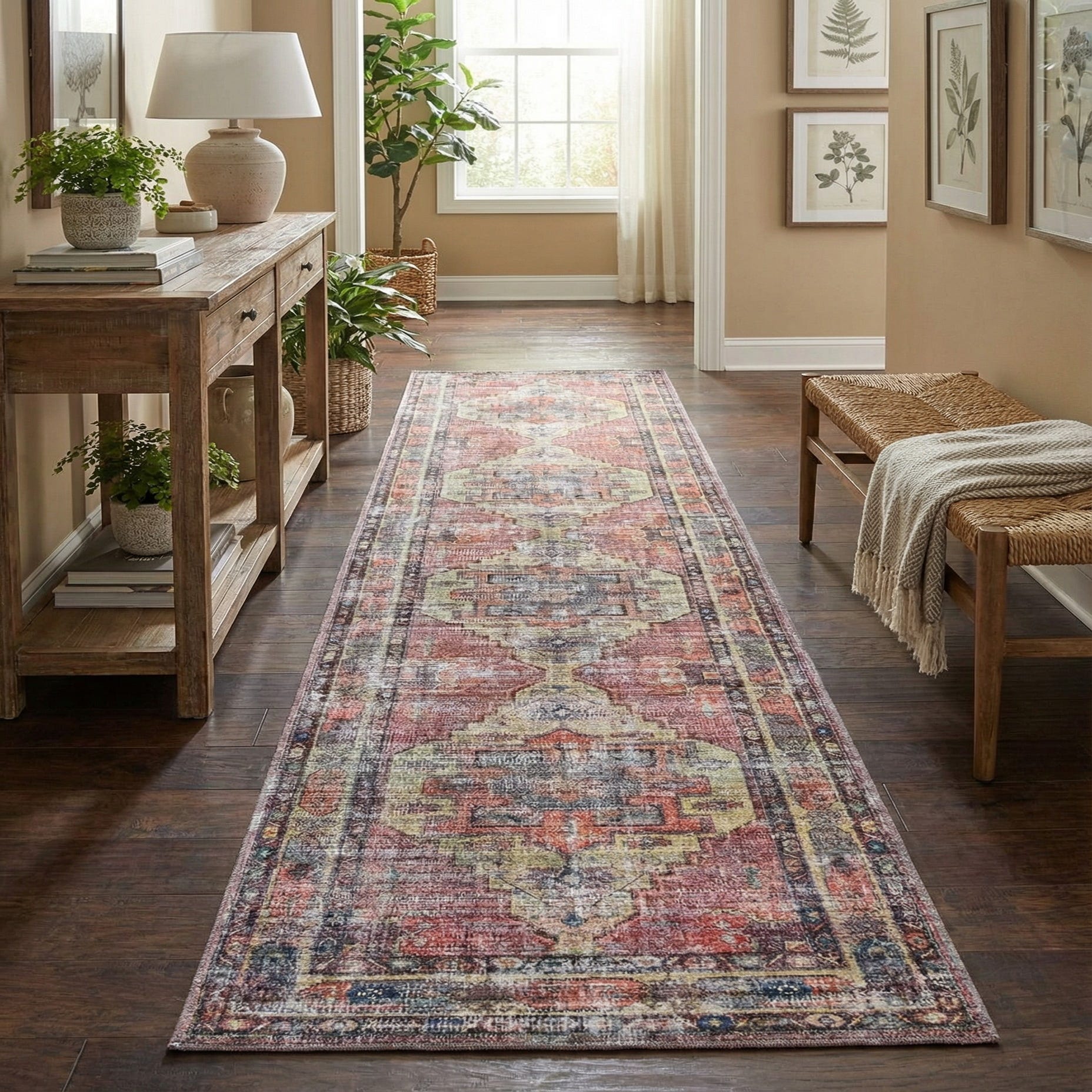 A timeless medallion runner with a gently distressed finish, this rug lays a warm Yellow Pink field beneath layered geometric motifs and a narrow, detailed border. Rust red and orange anchors the central medallions while accents of beige, brown, gray and ivory diffuse across the surface for a lived-in, vintage character. The pattern balances traditional ornament with a relaxed, faded look that adds visual depth without overwhelming a narrow hall or entry.
