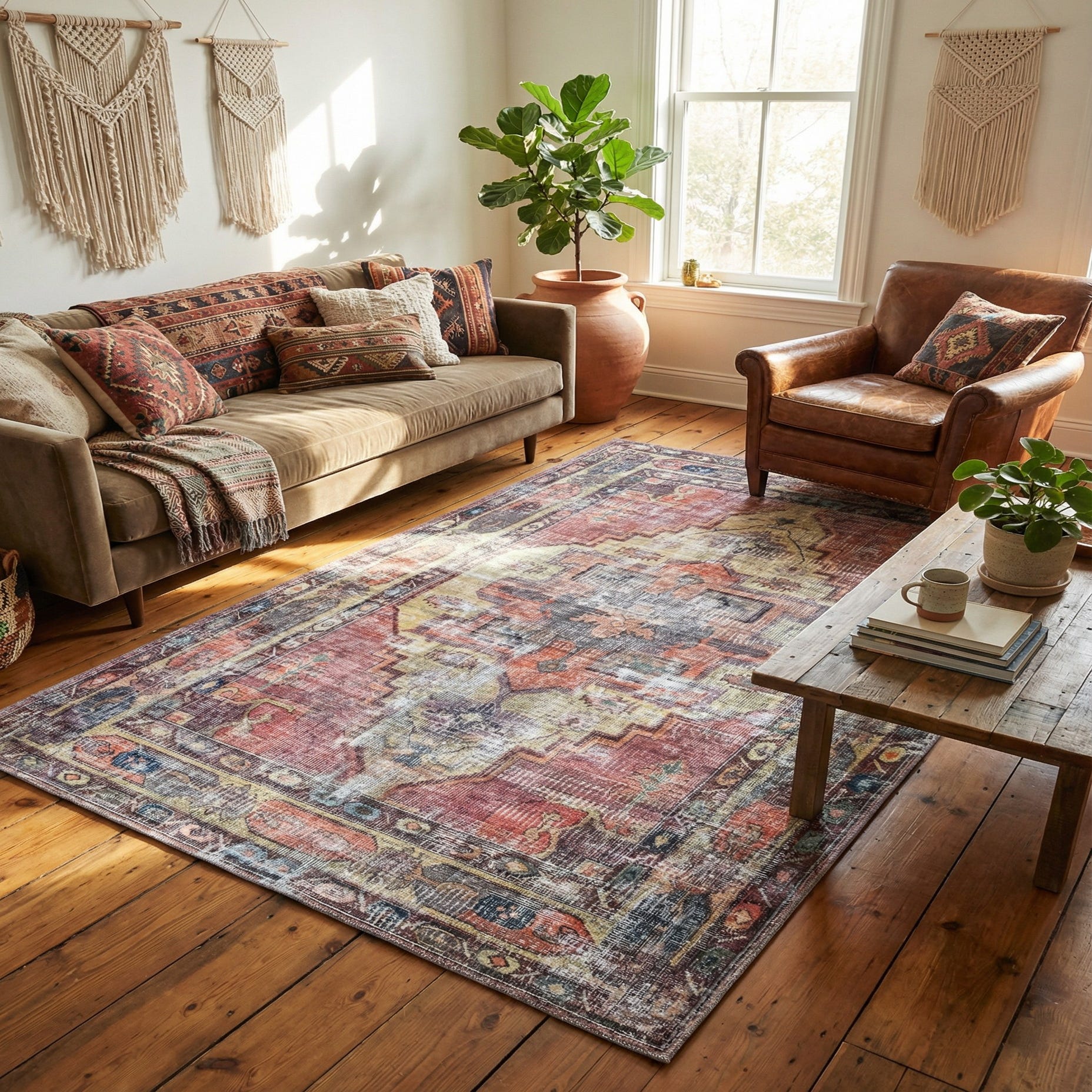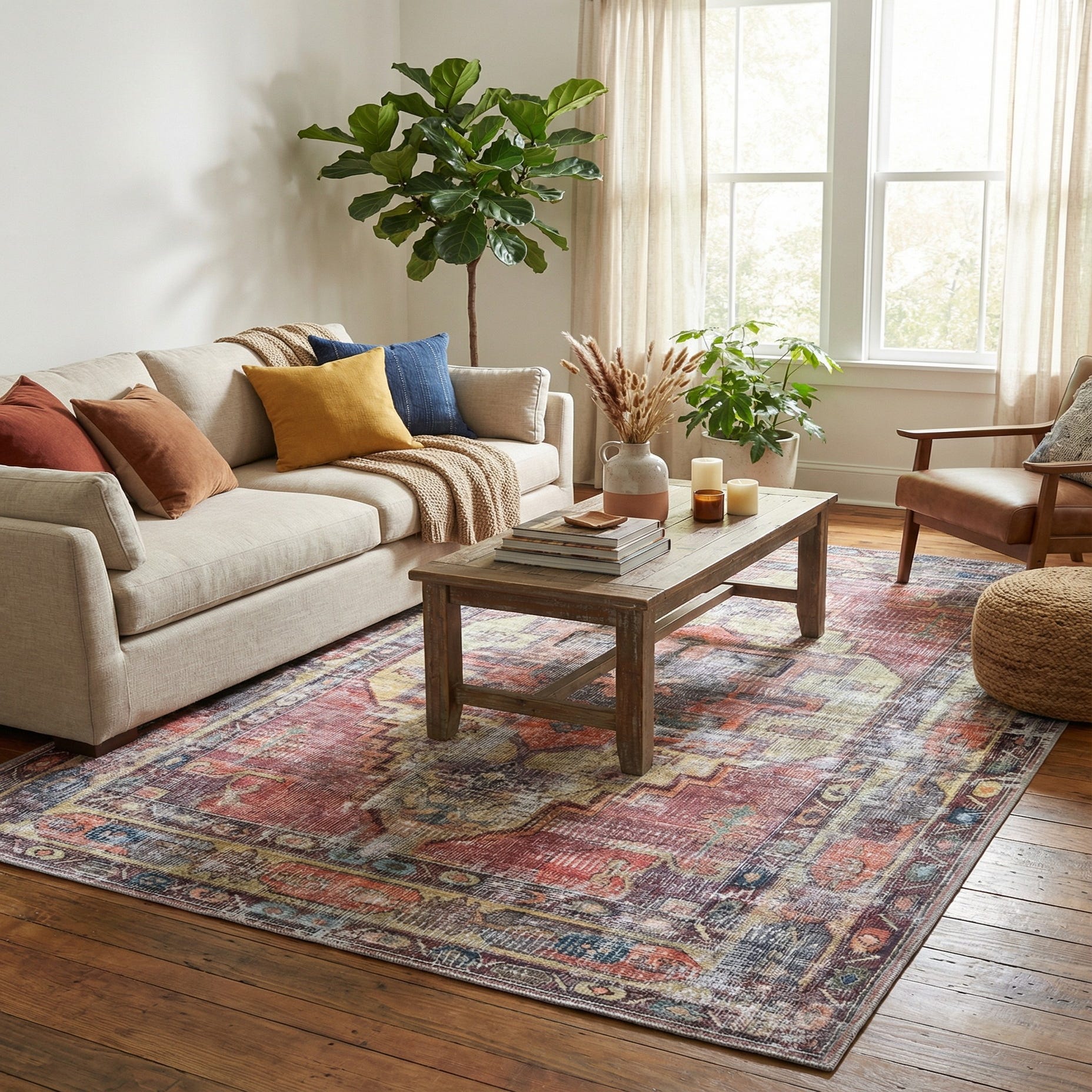 This Maahru area rug is ideally suited for spaces that seek a statement piece with a balance of color and pattern. It would serve well in living rooms paired with neutral-toned furniture to accentuate its vibrant hues, in dining areas looking for a touch of warmth, or even in bedrooms where comfort is a priority without sacrificing style. Its versatile design allows it to be integrated into both contemporary and traditional interiors, as well as eclectic spaces that embrace a mix of eras and influences.