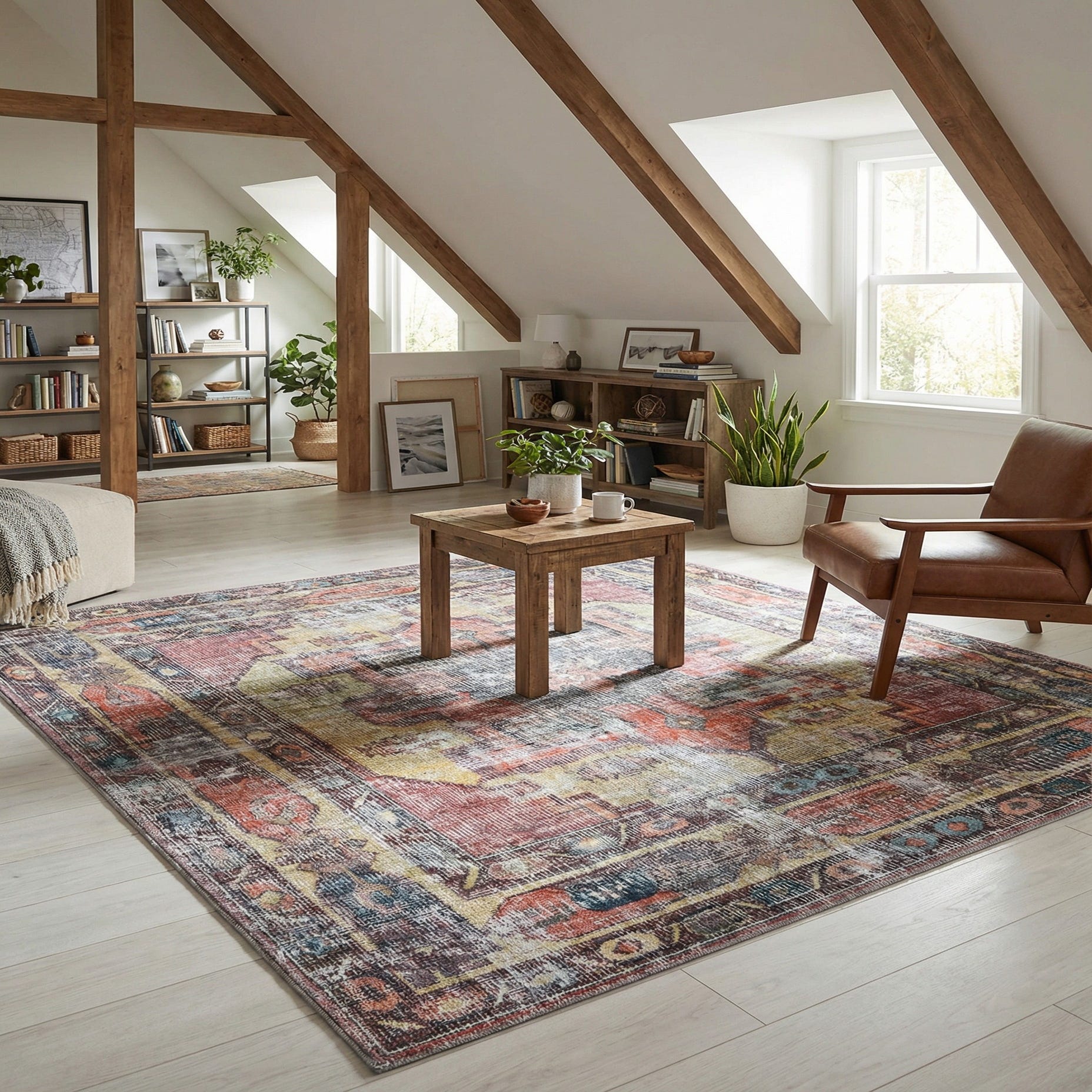 Place this rug to anchor a warm-toned living room or beneath a coffee table to define a seating area, pair it with a leather sofa and wood furniture for a mid-century look, or layer it in a boho bedroom with woven textiles and plants for added depth. Its balanced color palette and worn-in texture also work well in transitional spaces—entry halls, reading nooks, or a home office—where you want a comfortable, lived-in feel without overpowering the room.
