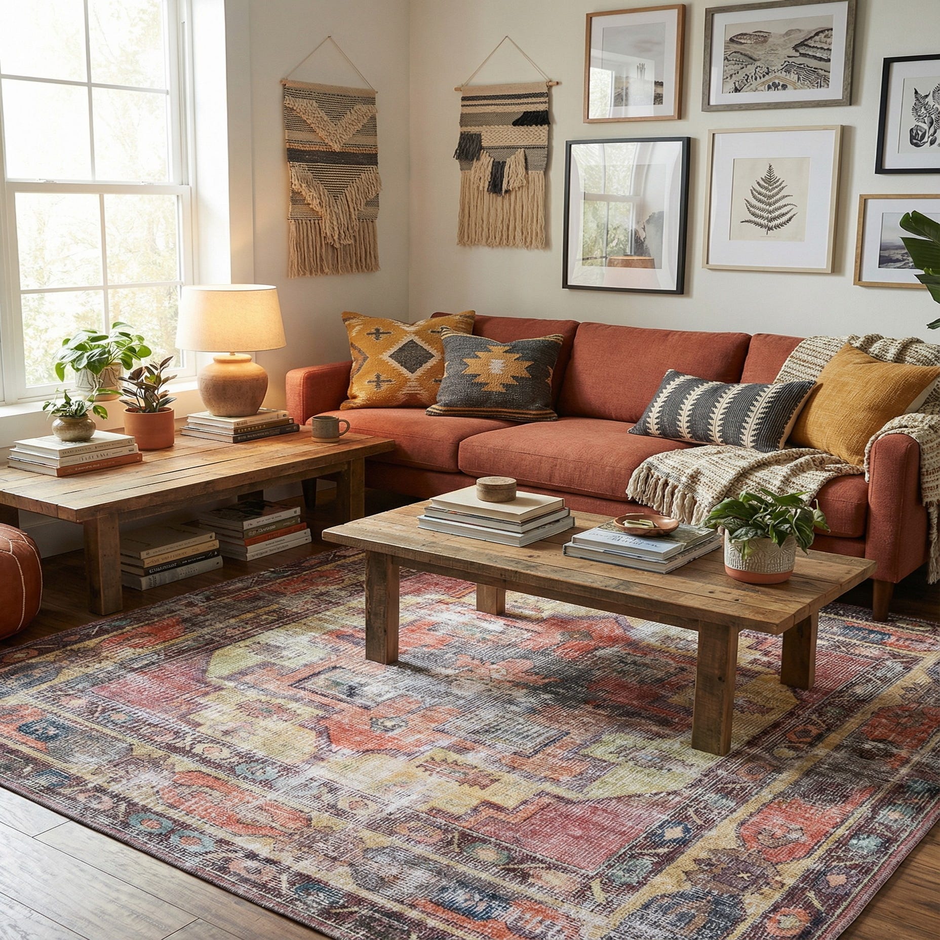 Machine made of polyester chenille, the surface has a soft, velvety hand and a low-profile pile that sits comfortably under furniture while still feeling pleasant beneath bare feet. This rug pairs well with warm wood tones and neutral upholstery for a cozy living room anchor, complements patterned pillows and woven throws in a bohemian or eclectic scheme, and can ground a bedroom seating area or entry hall where you want a lived-in, layered look with color and texture.