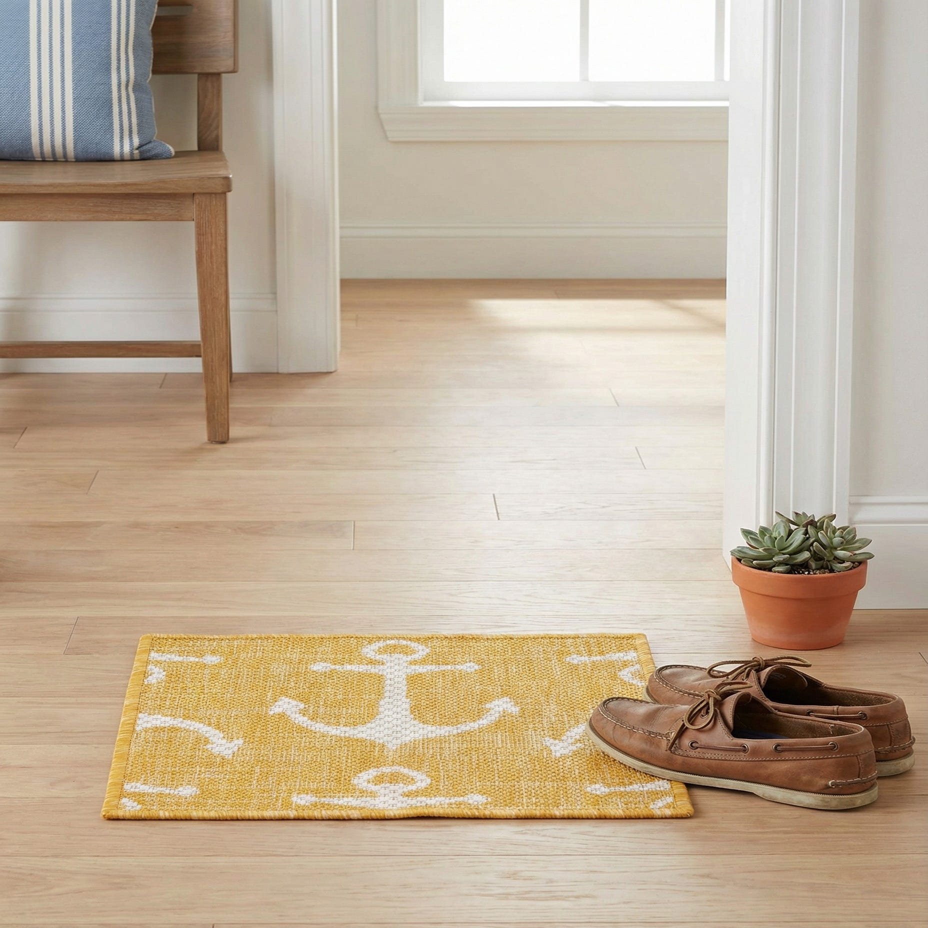 The bright yellow hue infuses energy into its surroundings, while the simplicity of the ivory anchors offers a classic maritime appeal. Its stain-resistant nature and flat texture provide a practical, pet-friendly, and shed-free solution for active living spaces where maintenance is a consideration.